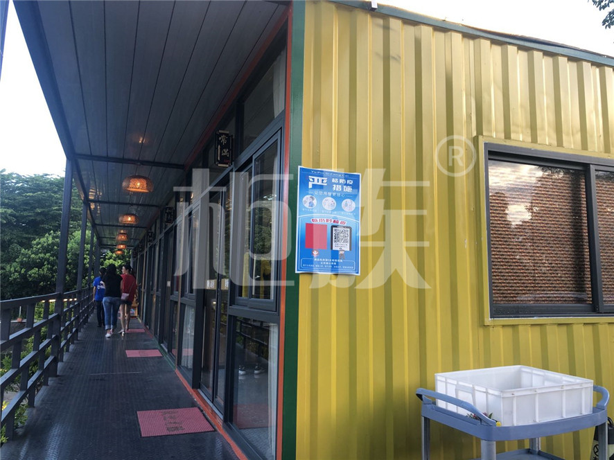 產(chǎn)品用材:鍍鋅方管框架、鋼化玻璃門窗、鋁花紋板走廊、生態(tài)木地板。